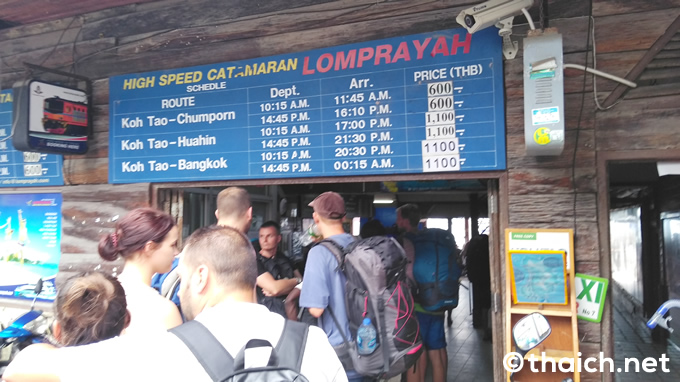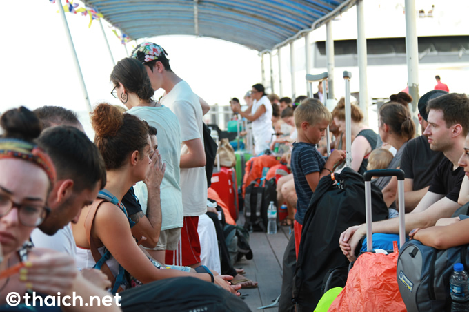 まずは出発前に、手配時にもらった領収書を持って、チケットオフィスでチェックインする必要があります。パンガン島行きのフェリは-サムイ島にも向かうため、大変混雑します。14時半ごろにチケットオフィスに到着したときには、沢山のチェックイン待ちの乗客で長蛇の列ができていました。