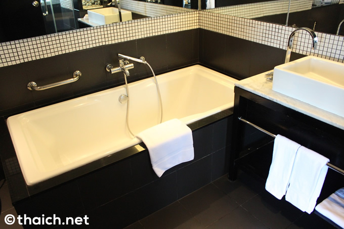 こちらは大人用のベッド。バスルームは浴槽付きなので、ゆっくりお湯につかって疲れを癒せます。