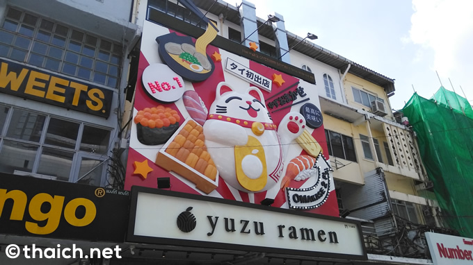 若者とファッションの街、バンコク・サイアムスクエアでソフトオープン中のラーメン店「ゆずラーメン(Yuzu Ramen)」に行ってきました。店頭のド派手な巨大な招き猫に惹かれるのか、新店にもかかわらず多くのお客さんで賑わっていたので、気になって入ってみたのです。