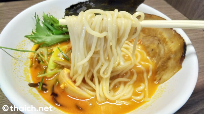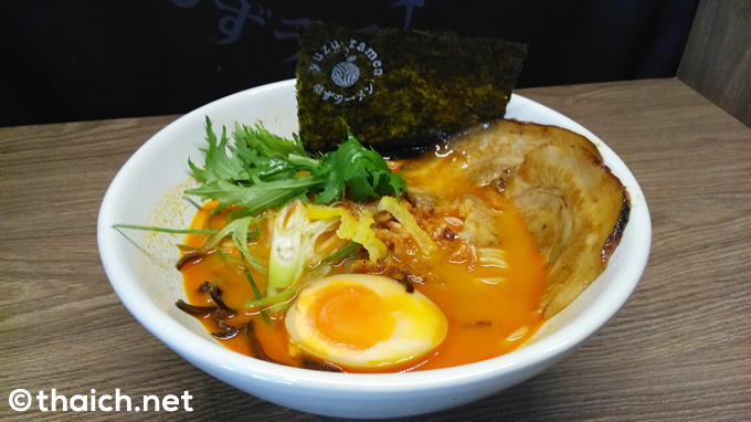 待つこと数分で出てきたのがこちら「辛口ゆず豚骨ラーメン」。スープがオレンジ色で、見た感じ日本のラーメンというよりも、タイのトムヤムヌードルかのような印象を受けました。