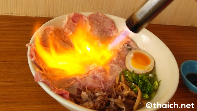 ラーメンのスープで”しゃぶしゃぶ”して牛肉に火を通すのでなく、店員さんがガスバーナーで炙ってくれるのです。写真撮影チャンス!このアトラクション最高!