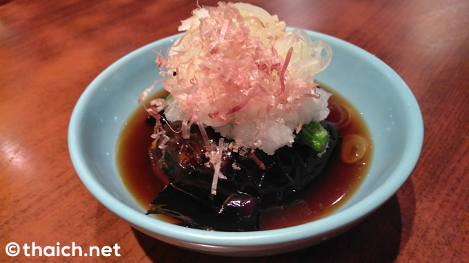 「揚げ出しナス」(120バーツ)は上にとろろがかかっていました。また写真を取り忘れましたが「もつ煮」(120バーツ)はビールが進みます!