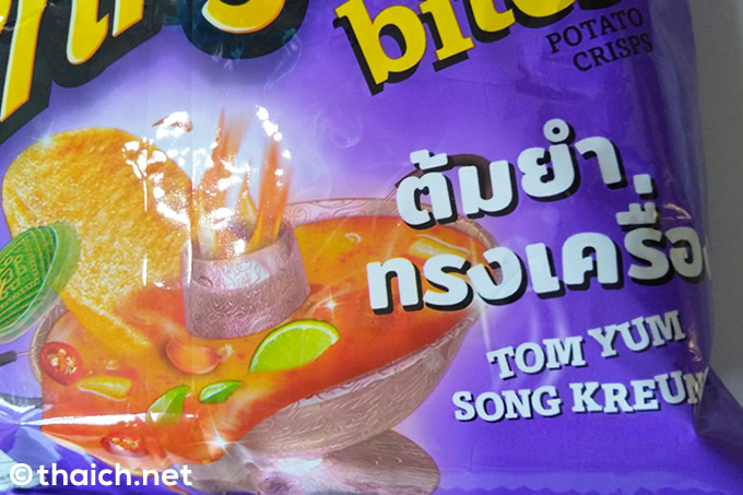 「プリングルス」といえば日本では筒に入ったものを思い浮かべますが、タイでは筒入りも勿論ありますが、最近では袋入りの「プリングルス バイト」が売られています。このトムヤムクン味も「プリングルス バイト」。バイト(bite)なので、一口サイズの小さめのチップスです。