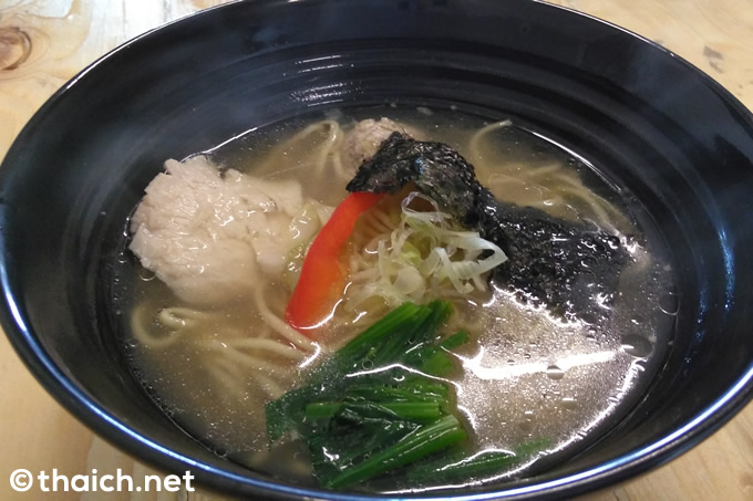 タイのラーメン店は豚のスープを出す所が多いようですが、ここは鶏のスープで勝負。注文したのがこちらの「鶏塩SOBA」です。