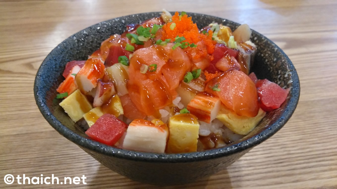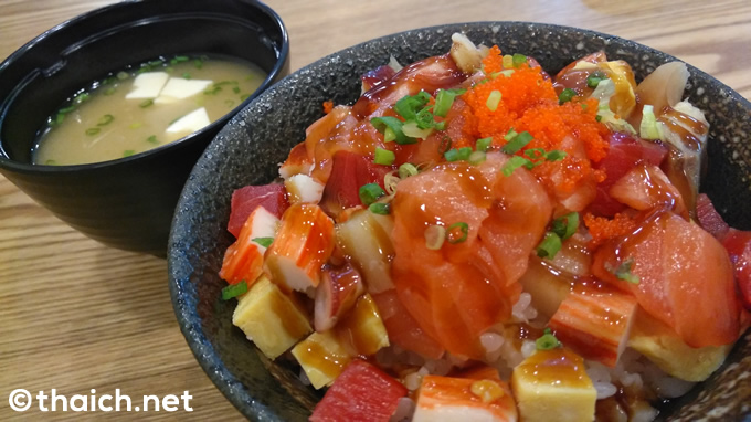 フォーチュンタウン地下はレストラン街になっていて、日本料理を出す店もありますが、「SushiNa」の寿司カウンターに惹かれて入店。メニューの中から、「バラちらし」(159バーツ)と「味噌汁」(29バーツ)、「グリーンティー」(20バーツ)をオーダー。税金やサービス料はかからないので、合計208バーツです。リーズナブルですね。