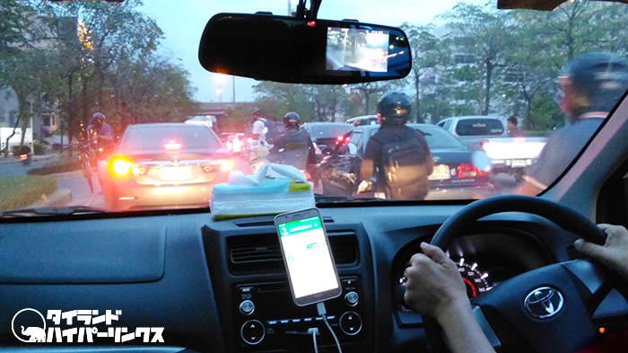 来た道を帰るわけですから「じゃあ200バーツで」と言うと、運転手はスマホの操作をはじめました。そして「Grabだと350バーツです。高速道路代は私が払うんで350バーツでお願いします」。