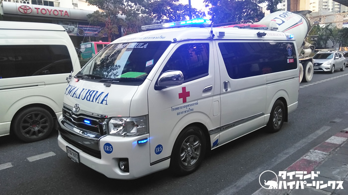 下の写真はバンコク・スクンビット通りで撮影したタイの救急車。タイの救急車は公共のものは少なく、多くが慈善団体か病院所有のものなのだそうです。在タイ日本大使館のウェブサイトにも「救急車が必要な場合は、その旨病院に伝えれば、その病院の救急車が迎えに来てくれる(有料)」と記載されています。