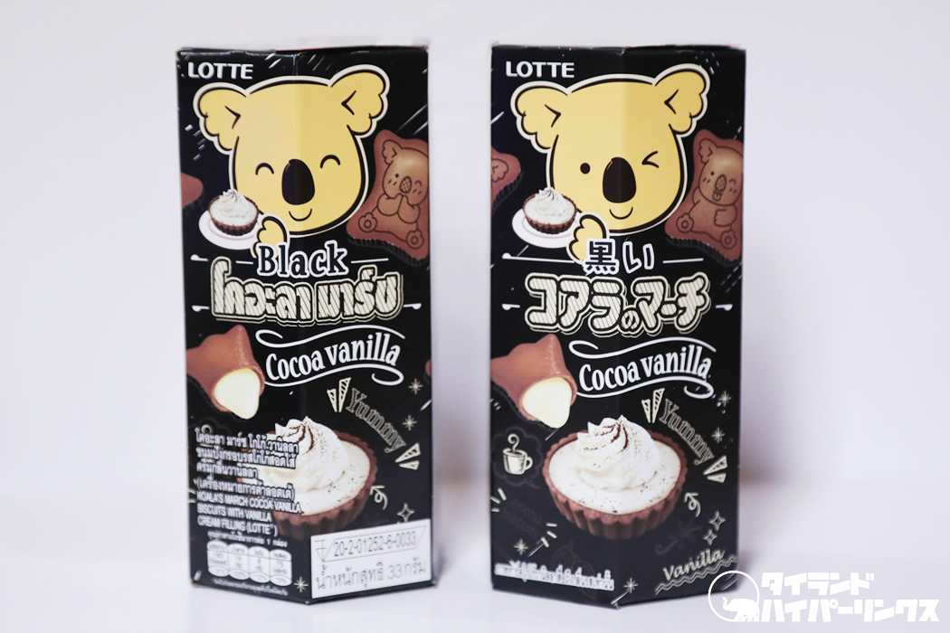 「黒いコアラのマーチ」というのは、ほろ苦いココアで黒くなったビスケットの「コアラのマーチ」のこと。日本では「黒いコアラのマーチ<ココア&ミルク>」が発売中ですが、タイで新発売になったのは「黒いコアラのマーチ<ココアバニラ>」です。