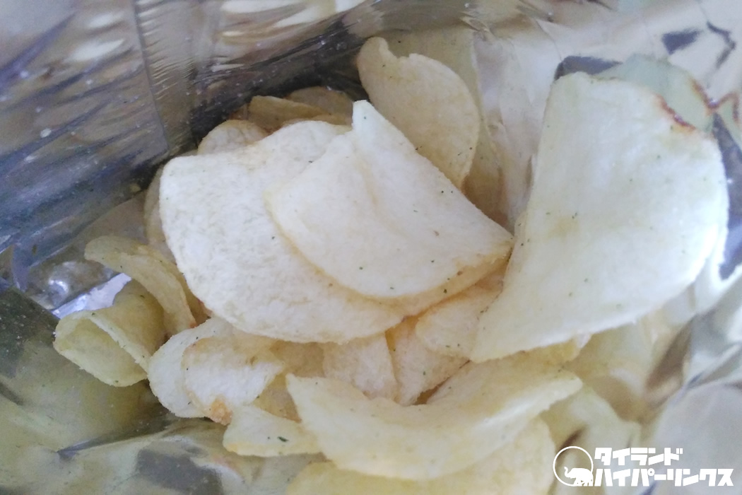 半信半疑で「冷たいレモン味」のパッケージをオープン。香ってみると、レモン風味が爽やかで、早くも冷たく感じている自分がいました(笑)。さらにポテチを一枚下の上に置いてみると、レモンの酸味で、またまた冷たく感じているではありませんか!これは暗示にかかっている状態では?(笑)