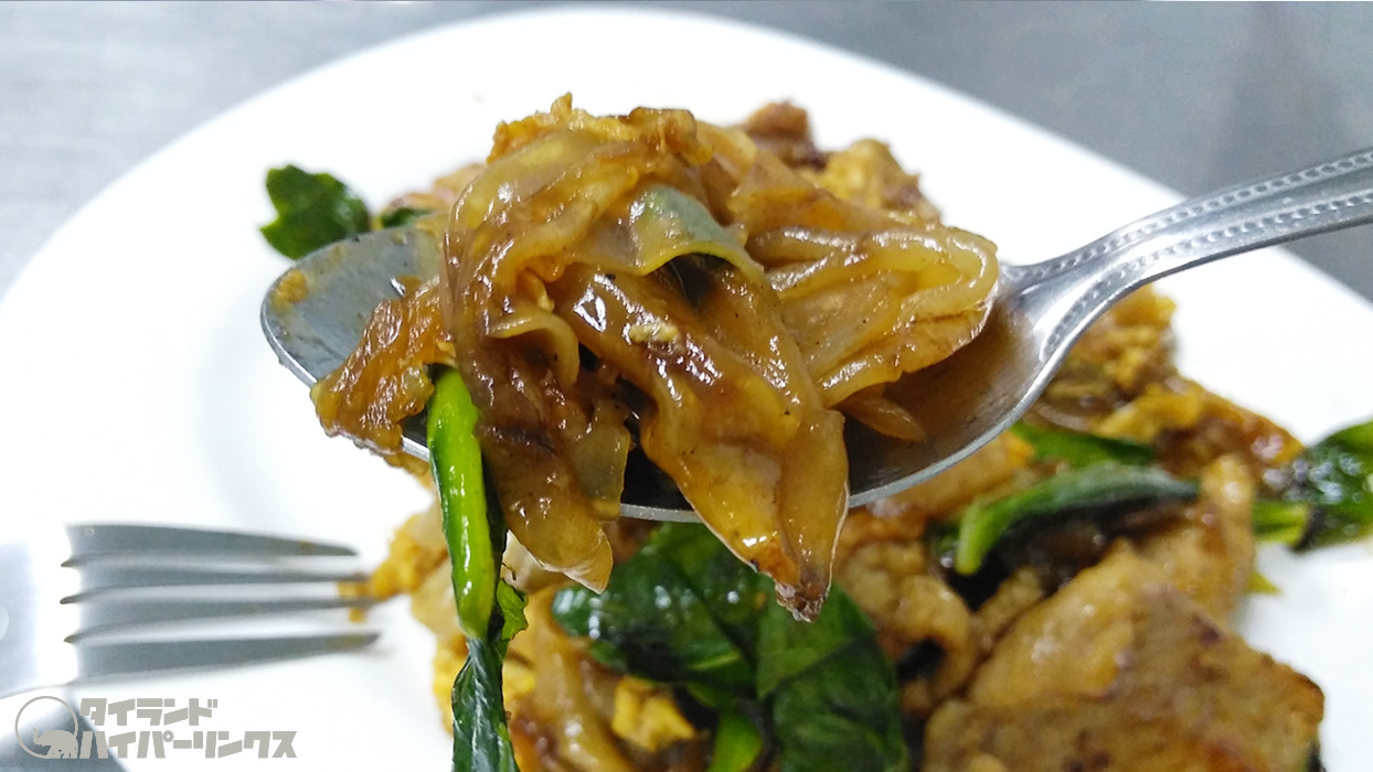 ランチで近所に出来たばかりのタイ料理食堂へ。あんかけ麺「ラートナー(ราดหน้า)」と醤油焼きそば「パットシーユ(ผัดซีอิ๊ว)」の専門店で、一皿50バーツ(約170円)の「パットシーユ」をオーダーです。