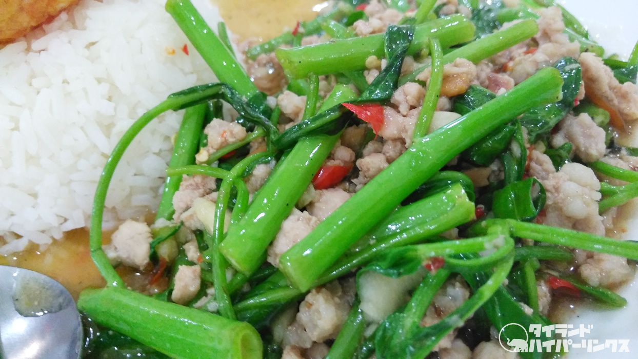 時々作り置き惣菜をご飯にかけてもらう「カオラートゲーン(ข้าวราดแกง)」、俗にいう「ぶっかけご飯」で空心菜炒めは食べるんですが、やはり作り置きなので、空心菜はクタクタになってしまいます。一方この日の食堂の空心菜は、炒めたててシャキシャキ。激ウマです!豚ひき肉の旨味も加わって最高!