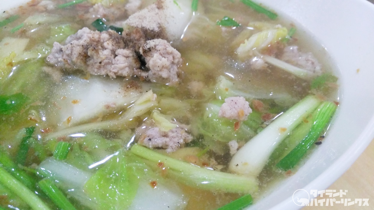 一緒に頼んだ「ゲーンチュート(แกงจืด)」は、辛くない澄んだスープ。下には豆腐が沈んでいます。海苔を入れても、とっても美味しいです。
