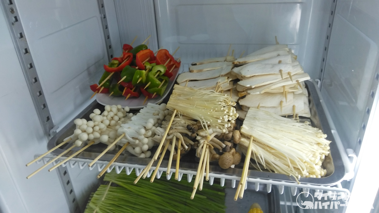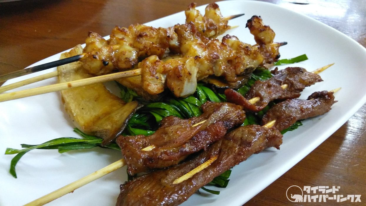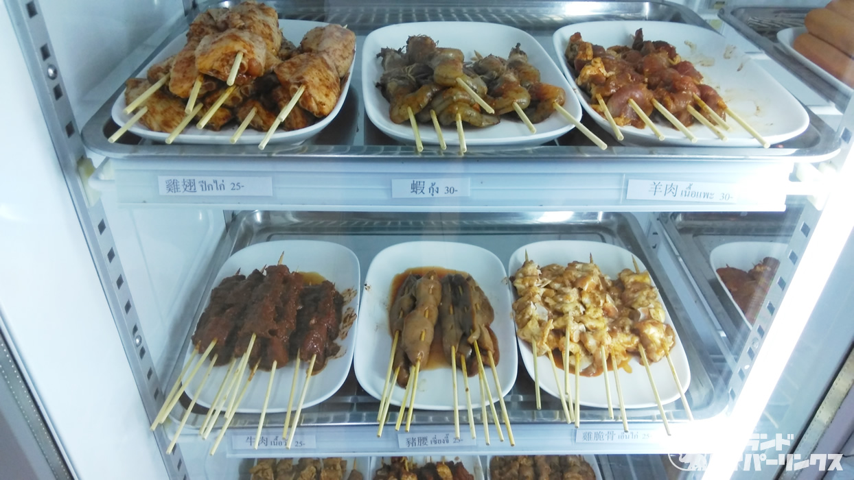 店内の冷蔵庫からセルフサービスで好きな串を選んで、店頭の網で焼いてもらいます。価格は一本20バーツから30バーツとお求めやすい価格。豚、牛、鶏、羊など肉の種類も豊富です。