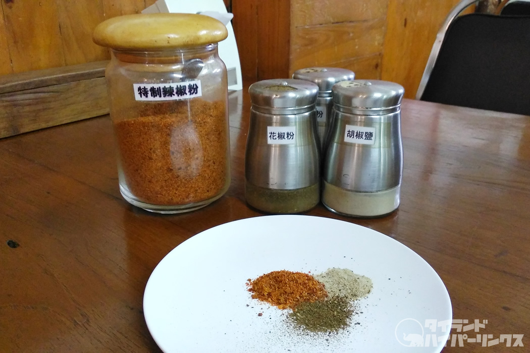 麻辣串焼とは、串に刺して焼いた肉や野菜に、たっぷりの香辛料をつけて食べる中華料理。「大三元焼烤」のテーブルには花椒、胡椒、クミンといった香辛料が置いてあります。隣の中国人のテーブルを見てみると、香辛料を取り皿に山盛りに盛っていました。