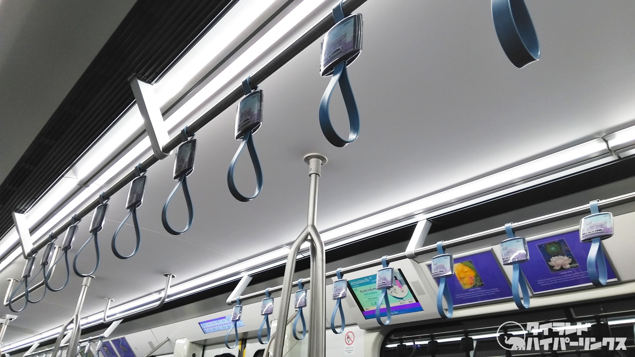 天井の吊り革がBTSやブルーラインが中央に1列なのですが、パープルラインは2列になっています。タイでは初めて見たので「日本式!!」と感じました。