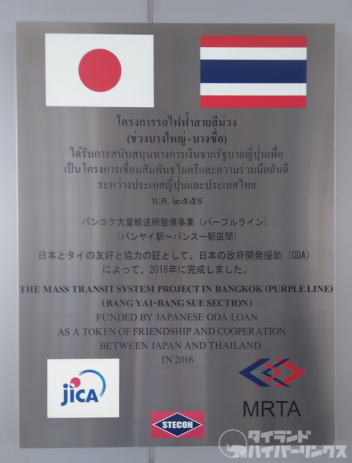 パープルラインは、日本のODAの援助によって完成したもので、駅構内にも、そのことについて日本語、タイ語、英語で記されています。