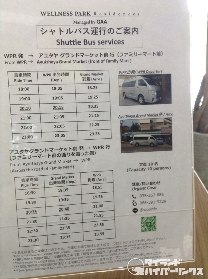 夜になると「ウェルネスパーク・レジデンス」と繁華街であるアユタヤグランドマーケット前を繋ぐ無料シャトルバスが、1時間に一本往復しています。外で食事をしたい!遊びに行きたい!という人にはとっても便利ですよ。