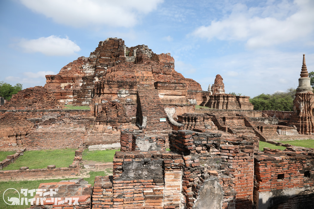 1369年~70年の2代ラーメスアン王が建てたという説と、1370~88年の3代ボロムラーチャー1世が建てたという説がある13世紀の重要な寺院の一つです。かつては塔の頂上が黄金に輝いていたこの寺院もビルマ軍の侵略により廃墟と化し、今は木の根の間に埋め込まれた仏像の頭や、頭部がない仏像、崩れ落ちたレンガの壁や礼拝堂の土台が残るのみとなっています。(ワット・マハタート Wat Mahathat|タイ国政府観光庁)