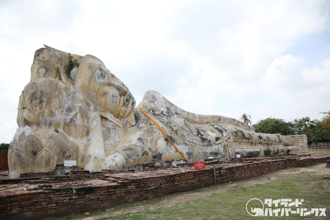 アユタヤの西方、クン・ペーン・ハウスの北側のうっそうと生い茂る広大な草原に悠々と寝そべる高さ5m、全長28mの巨大寝釈迦仏です。1956年に復元されたもので、80歳で入滅した仏陀をあらわしています。まわりには寺院も本堂もなく真っ青な空、澄みきった空気のもと、長い手足をゆったりと伸ばし、静かな笑みを浮かべているかのように横たわりながら、繁栄を続けたアユタヤ王朝から今に至るまで、時代の栄枯盛衰を見つめ続けています。(ワット・ロカヤ・スターラーム Wat Lokaya Sutharam|タイ国政府観光庁)