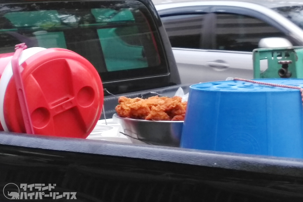 我が家の近所にも美味しいと評判のカオマンガイ屋さんがあって、「カオマンガイトード」もメニューにあるんです。しかし屋台なので、鶏を揚げるスペースがなく、どこかで揚げたものを屋台に運んでくるのですが、驚きの場面を見てしまいました!