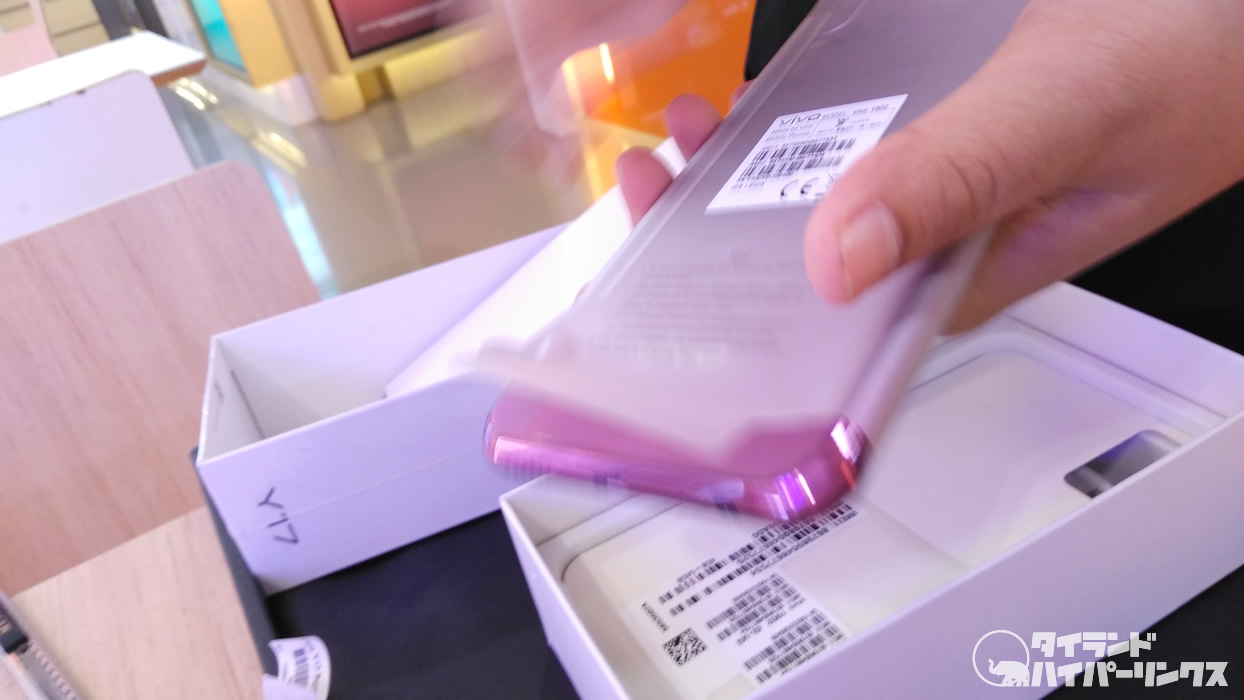 そんな中で見つけた「Vivo Y17」。バッテリーは、使い方にもよりますが、恐らく朝から外に出て、夜に帰ってきても途中で充電はほぼ必要ないだろうという大容量の5000mAh。カメラも3レンズ、もちろんダブルSIMで、モニターも大きく6.35インチ。そして価格は6,999バーツ(約2万4,000円)で申し分なし。ちなみにバッテリー5000mAhは、お店に置いてある商品の中で一番でした。