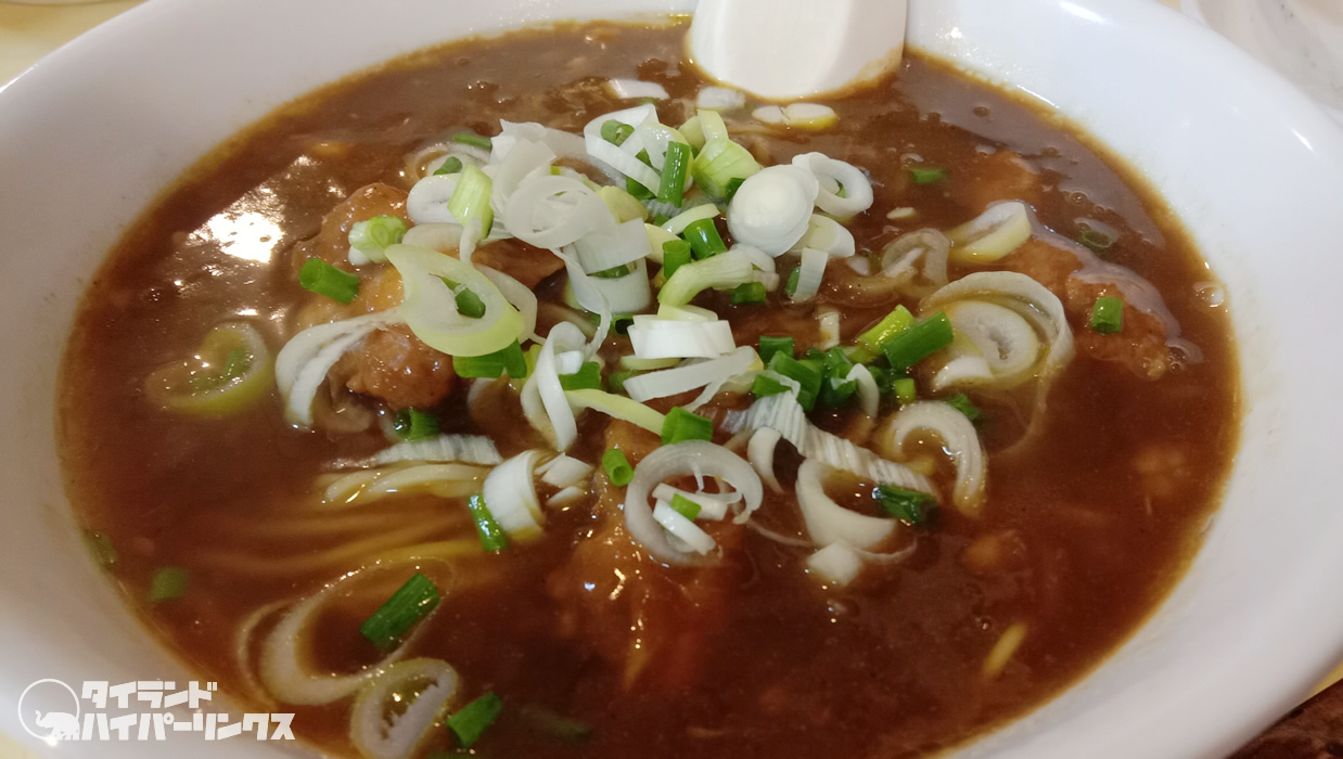 食べて飲んで、締めはラーメン。これまで「らあめん一番」では200バーツの「みそラーメン」と150バーツの「冷やしソバ(冷やし中華のこと)」しか頼んだ事がありませんでした。しかしこの日は、いつもとは違うものが食べたくて170バーツの「カレーソバ(カレーラーメンのこと)」を頼んでみました。個人的には日本にいたら絶対に頼まないメニューですが、挑戦してみたくなったのです。