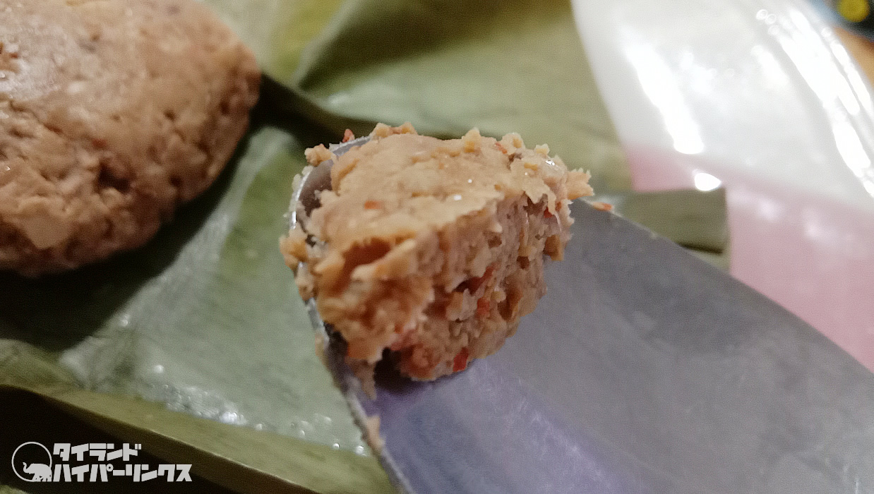 なるほど、確かに色は納豆ですが、日本の納豆のように豆の形はなく、ペースト状に仕上げてあるんですね。中の赤いつぶつぶは唐辛子でしょう。