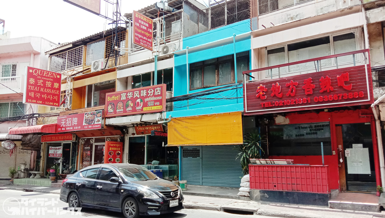 MRTホワイクワン駅を下車。ラチャダーピセーク通りからホワイクワン交差点を東に入ったのが、プラチャーラートバンペン通りです。周辺にホテルがいくつかあり、多くの中国人観光客が集まるので、多くの中華料理店や中国人向けのお土産屋さんなどが並んでいます。最近ではミニ中華街なんて呼ばれることも多いですね。確かに漢字の看板だらけ。