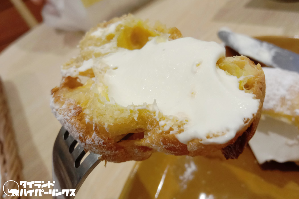 1つ60バーツのバニラ フレッシュクリームを何個か持ち帰りにして、一つはその場で食べることにしてテーブルに着きました。