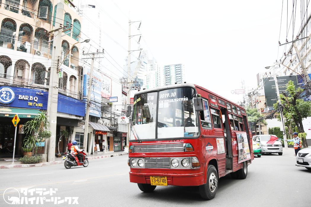 トンロー通りを南北に移動するなら、赤いミニバス、その名も「トンローバス」です。ルート内ならどこでも手を挙げれば停まってくれますし、降りたい場所で降りることができます。運賃は一律7バーツと激安。ただし、トンロー通りを北から南に移動する時は「宿屋」の前は通りませんので(途中で右折してしまいます)、終点のBTSトンロー駅まで行って、歩いて「宿屋」に戻れば簡単です。