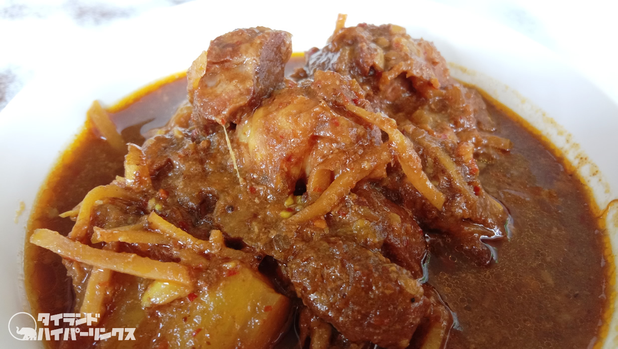 こちらがゲーンハンレー。色合いは日本で食べるカレーライスのようです。ジャガイモっぽく見えるのは豚肉の脂身。具材は見える限りでは、豚肉と生姜のみのようですね。