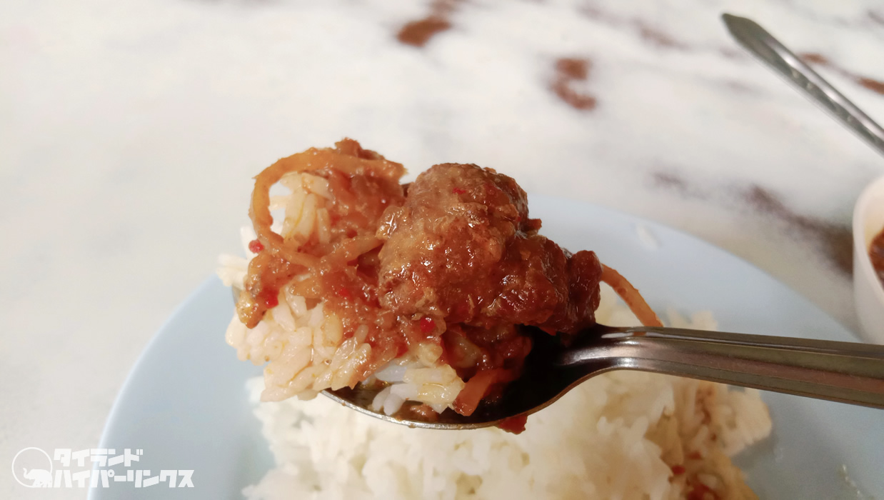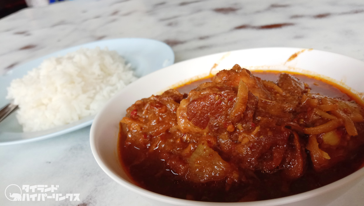 早速いただいてみると、見た目の通り、味も日本のカレーに近い感じじゃないですか!グリーンカレーが口に合わないという人は少なくないと思うのですが、ゲーンハンレーは日本人の口に合うこと間違いなし。これ美味しいです!「街一番のカレー」という看板の言葉は、伊達じゃありませんでした。