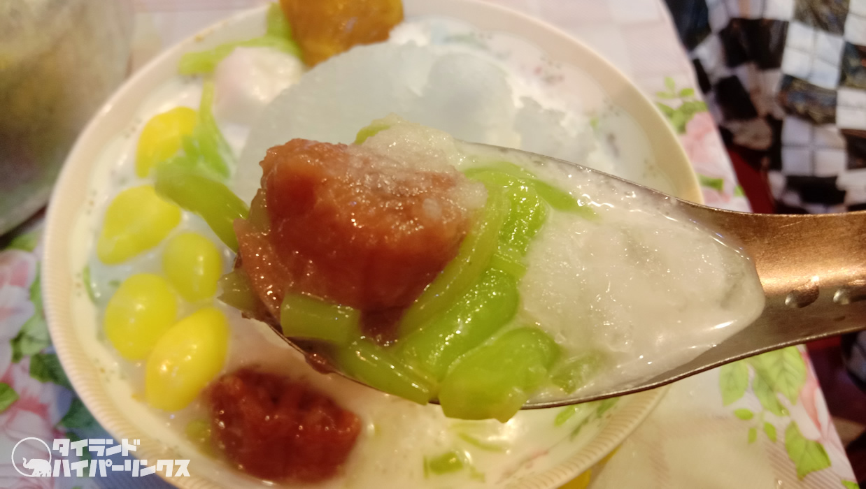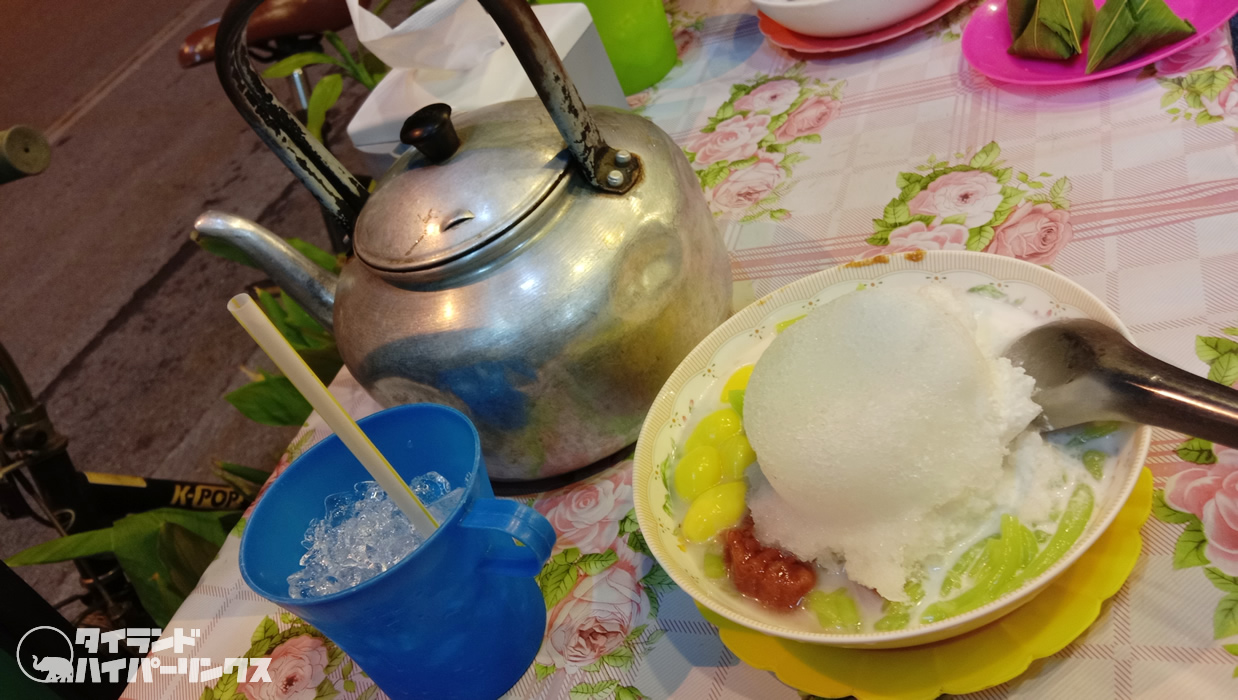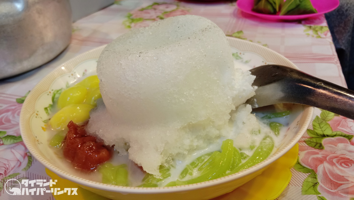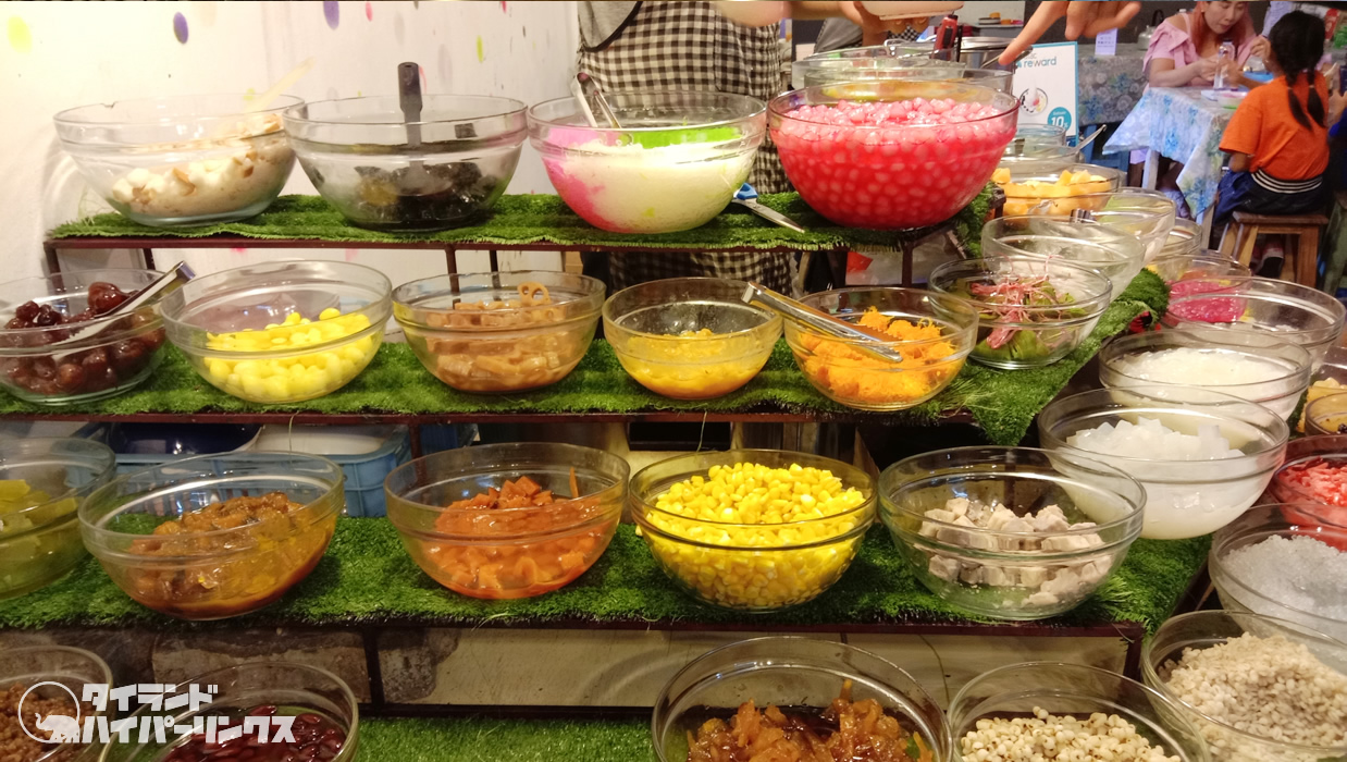 「カノムワーン・チャーンモーイ」で食べられるのは、ルアムミット(รวมมิตร)というスイーツ。お好みの具材にココナッツミルクをかけて、その上からかき氷を乗せるというもの。逆かき氷?