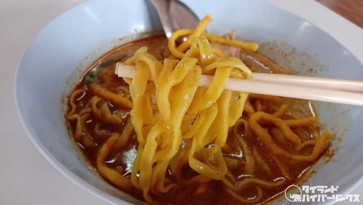 麺は太めの縮れ麺。このチェンマイの旅行で3回カオソーイを食べましたが、どこも麺が異なりました。
