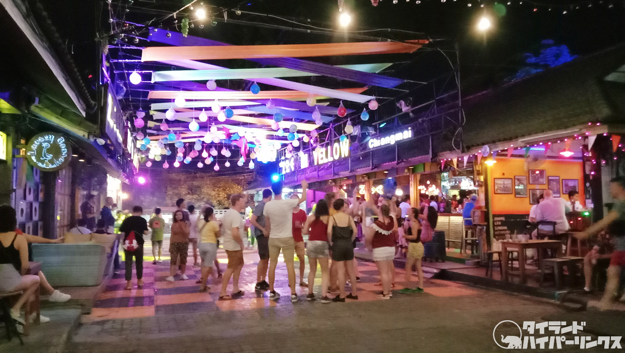チェンマイ旧市街で、多くのパブやバーが並ぶ通りがあります。それがRatvithi通り(またはRajvithi通り)。夜になると地元の若者や外国人旅行者たちが続々と集まってきます。特にウォーキングストリートと呼ばれるナイトマーケットが開かれる日曜日は、たくさんの人々で盛り上がるのです。