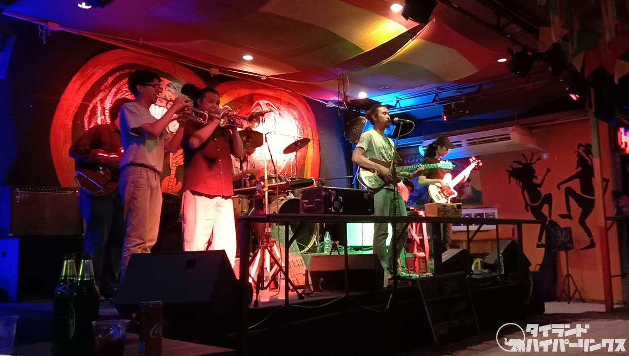 ここでは店内ではバンドによる演奏が行われています。料金も安く、チャージはなしで、ソフトドリンクは40バーツ、カクテルも100バーツなど。セルフサービスなので、カウンターで支払い、ドリンクを受け取り、席に着いてレゲエを楽しむのです。