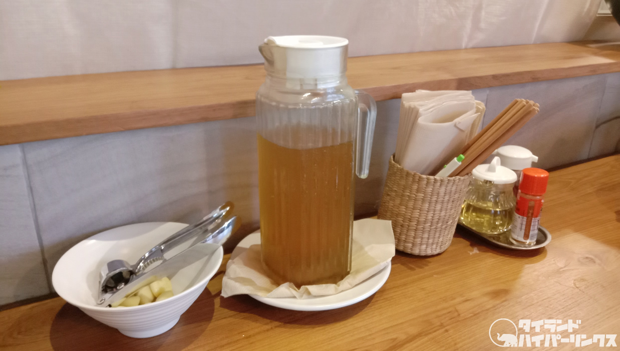 冷たいお茶は無料で、税金、サービス料はかかりません。ラーメンに潰して入れる生のにんにくも置いてありますね。
