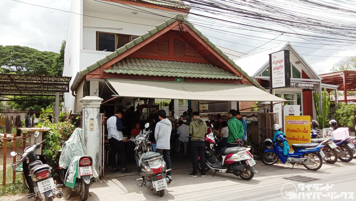 地図を見ながら、午後1時頃に到着した「カオソーイ・メーサイ」がこちら。なんと店の前で待っている人がたくさんいるではないですか!「カオソーイ・メーサイ」は、地元タイ人も旅行者もが集う、超人気店だったのです。