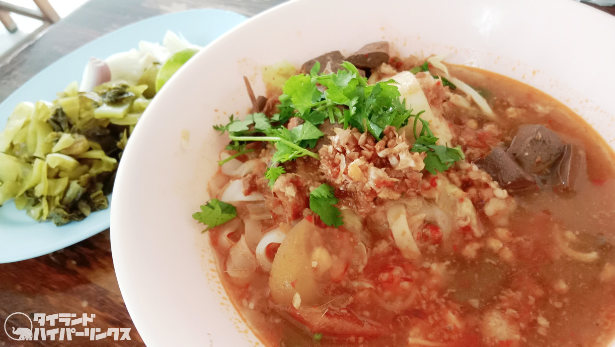 ナムギアウというのは、豚肉とトマトなどで煮込んだピリ辛スープ。カノムチンという素麺のような米麺と一緒に食べることが多いのですが、ここではナムギアウにクワイティアオという米粉麺で食べるんですね。チェンライ県メーサイで食べられる料理なのだそうです。