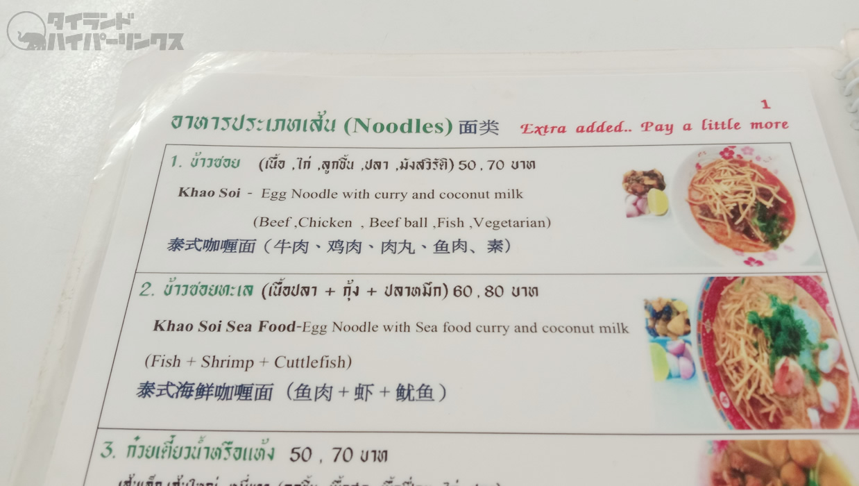 メニューはこちら。ハラールなので豚肉はありません。50バーツの牛肉のカオソーイをお願いしました。