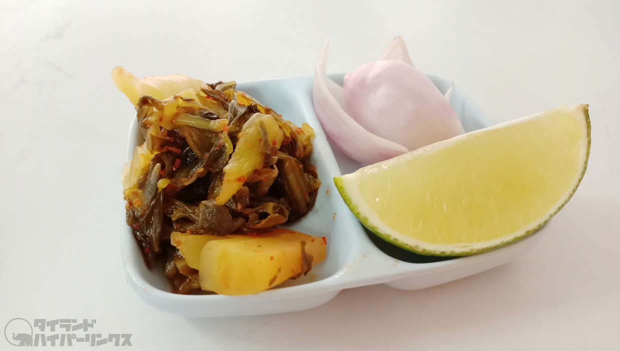 カオソーイにパクドーン<ผักดอง>というタイの漬物と玉ねぎを乗せて、マナオ(ライム)を絞ります。