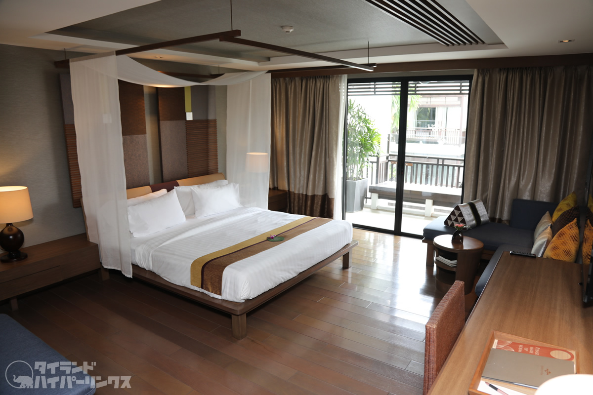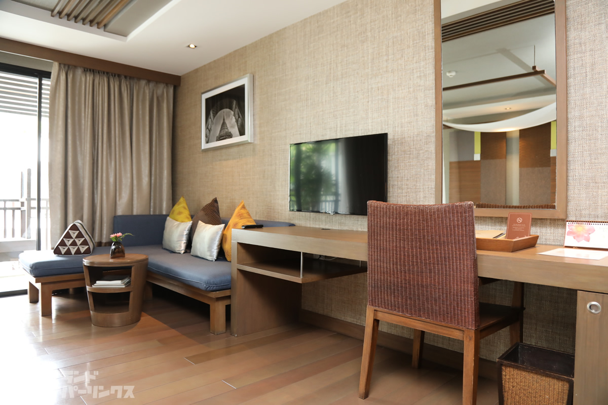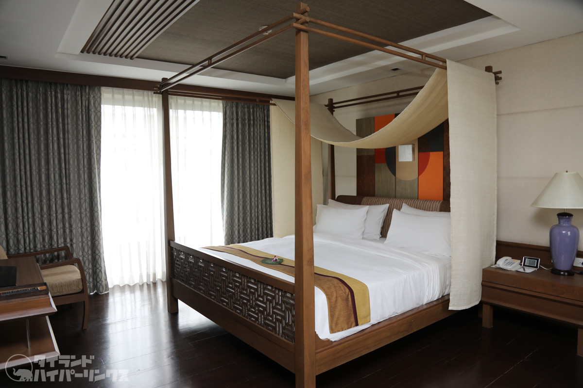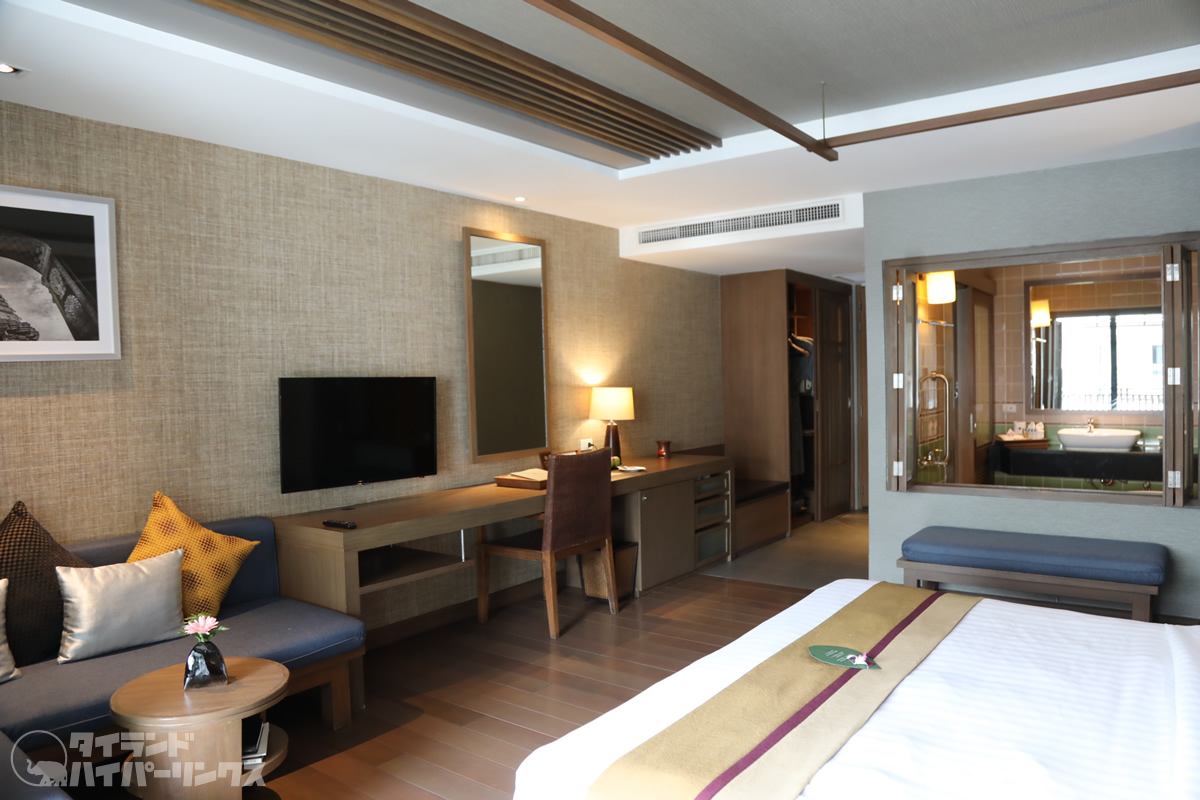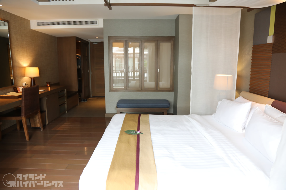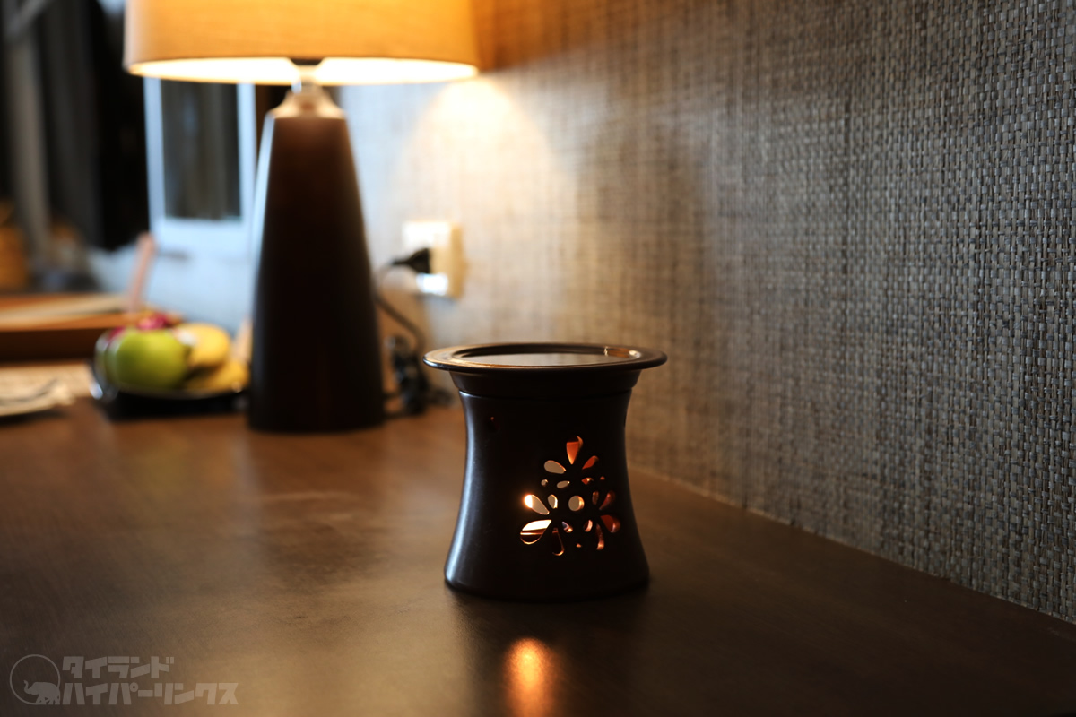 4階のDELUXE ROOM。客室の扉を開けた瞬間香るアロマ。何と言っても「ラリンジンダ ウェルネス スパ リゾート」は、バンコクなどで有名スパを運営するSiam Wellness Groupが手がけたホテルですから、客室もリラクゼーションに拘っています。時間が経って、アロマの火が消えてしまったら、スタッフさんに追加をお願いしましょう。