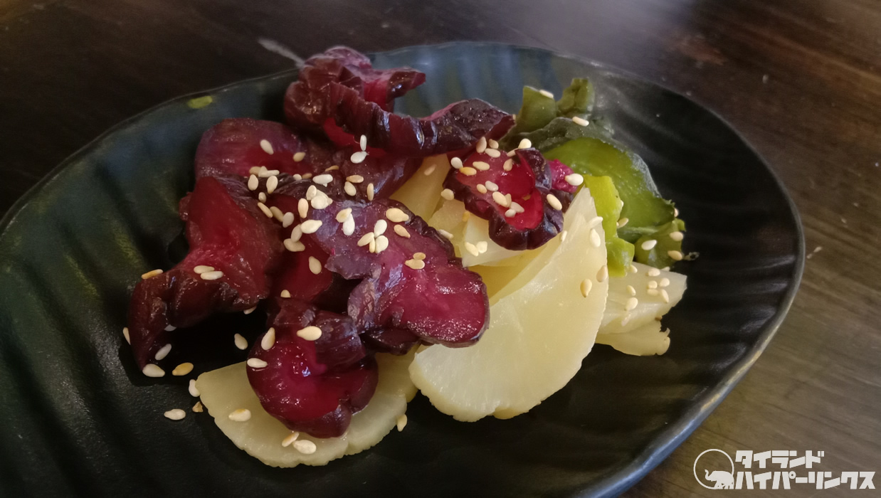 実はこの日は他で遅い夕食の約束があったため、「剣心」では軽くツマミでお腹を満たす程度で。刺し身や鍋などをはじめとして豊富なメニューが揃う中、まずは「ピクルス3点盛り」(48バーツ)。漬物です。