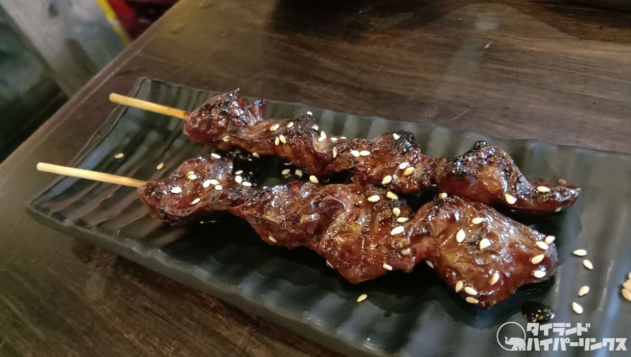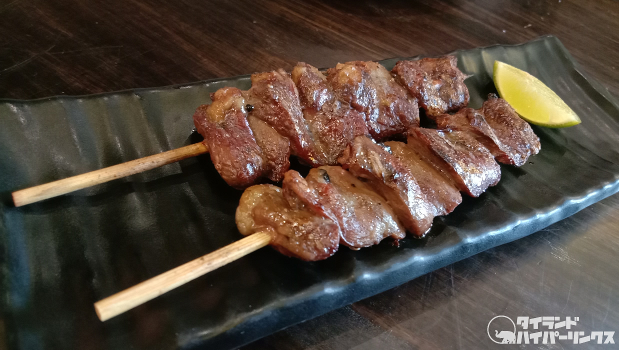 焼き鳥は2本で28バーツと38バーツと格安。「鳥レバー焼き」(28バーツ)と「ハツ焼き」(28バーツ)です。