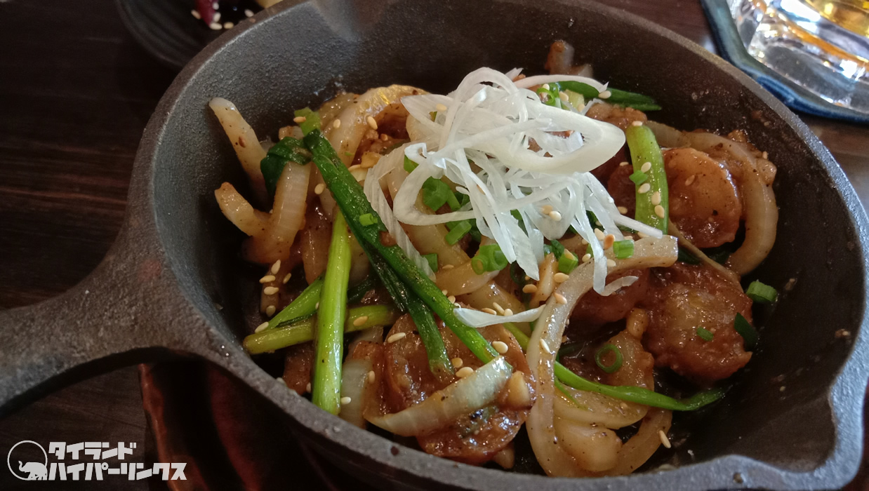 「牛ホルモンの味噌炒め」(158バーツ)。ホルモンは、外はサクッ、中がトロ~。ご飯が欲しくなるかも。