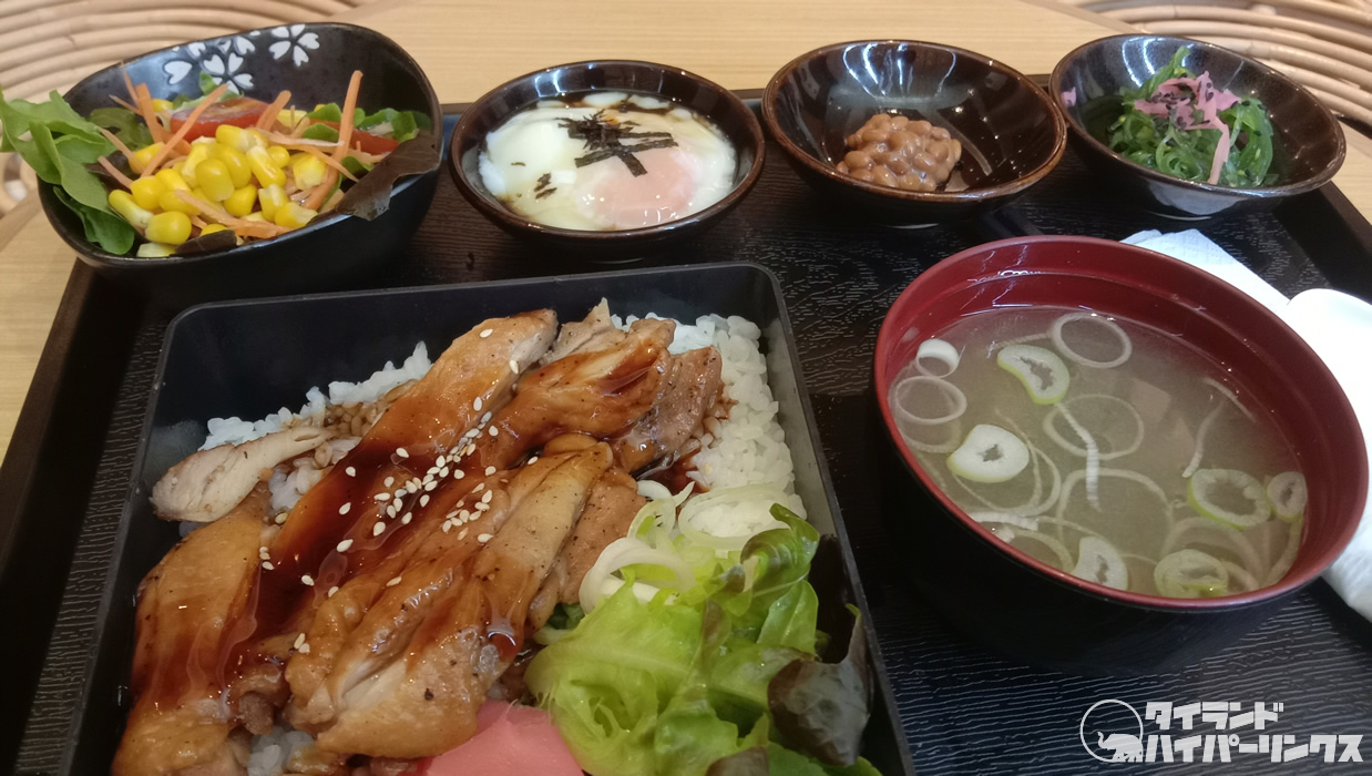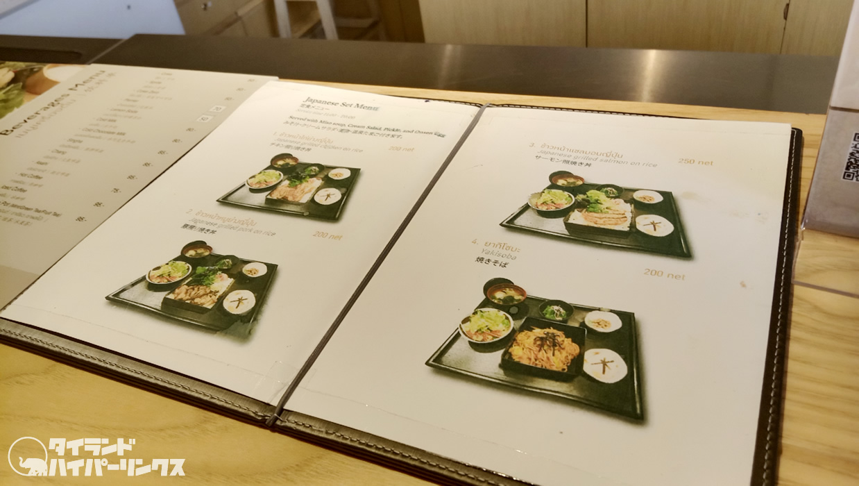 メニューを見ると、和食セットのオーダーが可能なようです。メニューはチキン照り焼き、サバ照り焼き、サーモン照り焼き、そして焼きそばで全て200バーツ(約700円)。まわりを見ると、結構食事をしている人がいるんです。みな考えることは同じなんですね、「1日中ここで過ごしたい」!