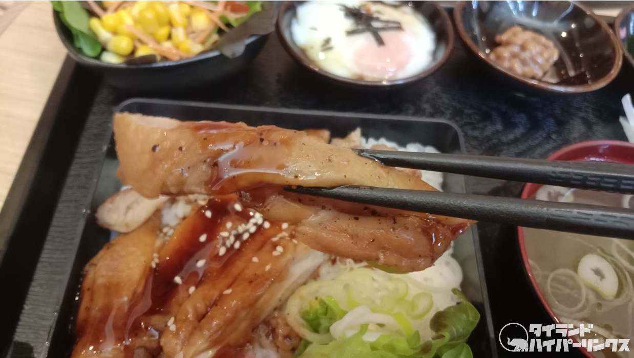 そうこうしているうちに、料理が運ばれてきました。こちらがチキン照り焼きセット。メインのチキン照り焼きと味噌汁、サラダ、温泉玉子、納豆、中華わかめ。 そういえば納豆久々!