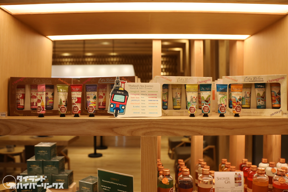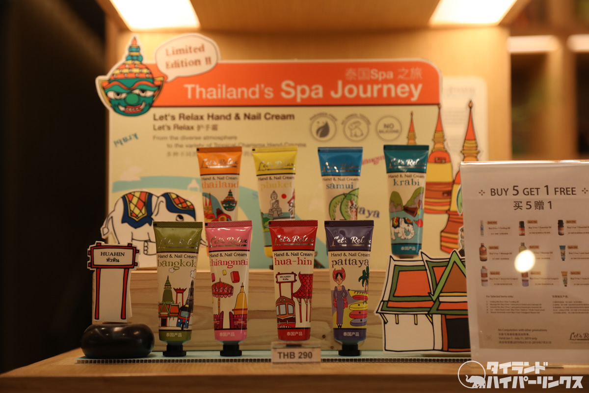 こんなタイのデザインを取り入れたかわいい商品もありました。日本へ帰るときのタイ土産にピッタリです。タイ各地のイメージがパッケージになったハンド&ネイルクリームです。