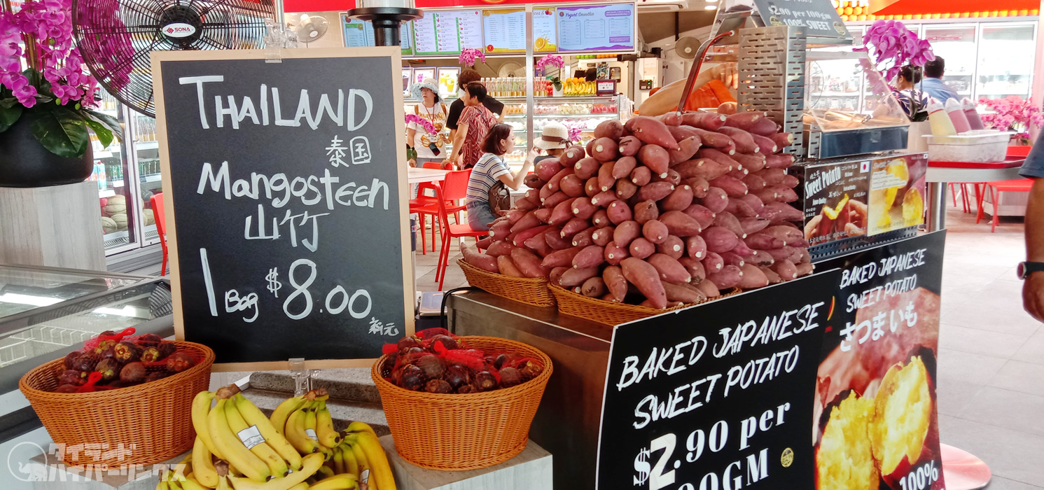 ここではタイ産の果物も売られており、マンゴスチンは1袋8シンガポールドル(約600円)。