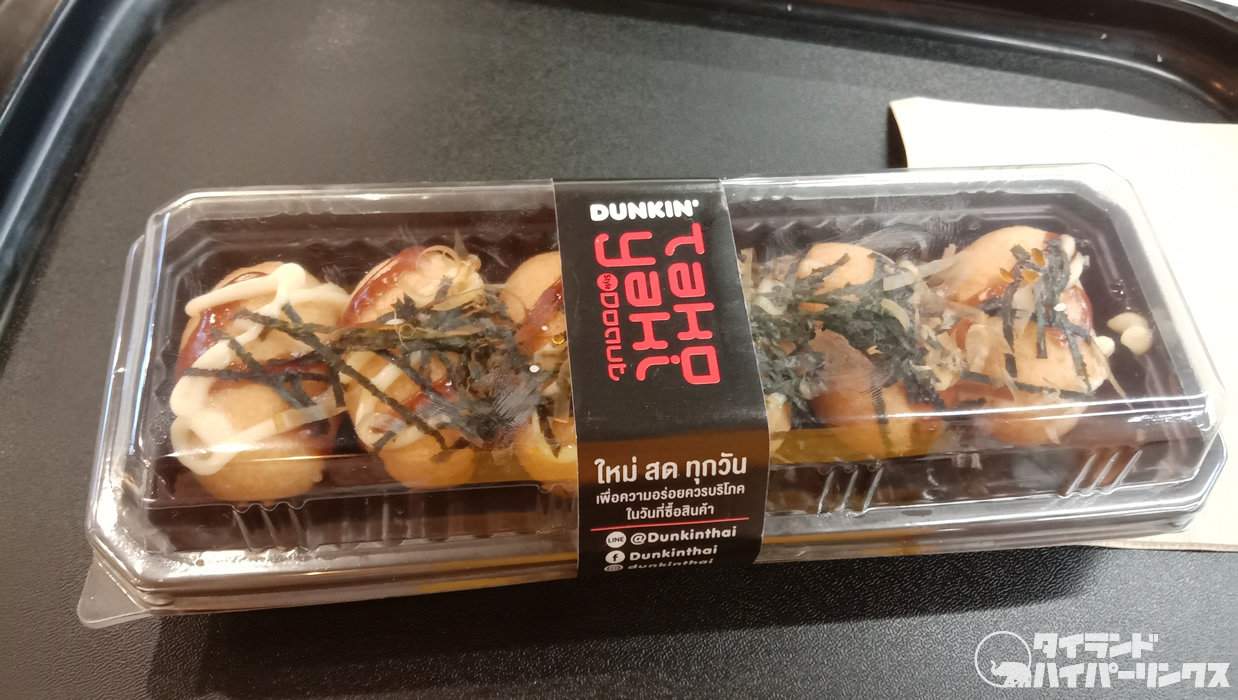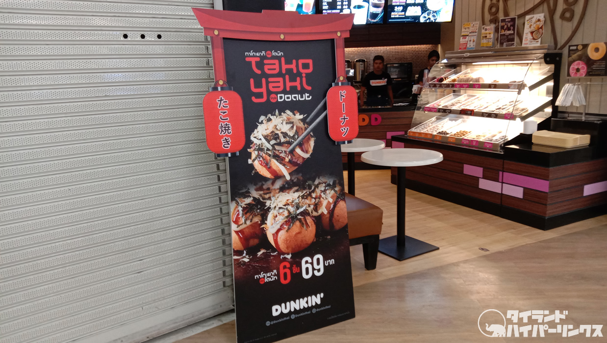 食事を終えた後に地下鉄の商店街を歩いていると、目に入ったのがタイで100店舗以上を展開する「ダンキンドーナツ(DUNKIN)」。ちょっと甘いものが食べたいな~、ということで寄ってみました。そこで見つけたのが「たこ焼きドーナツ」の立て看板です。
